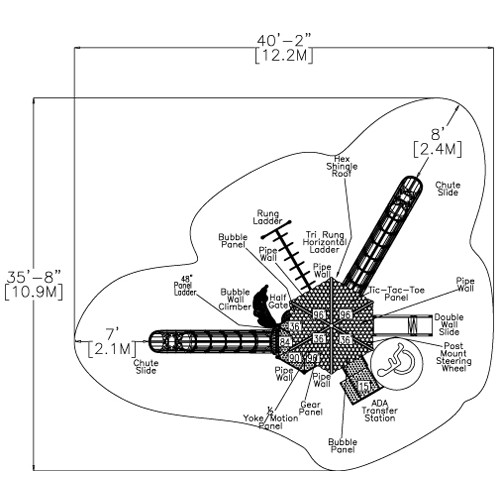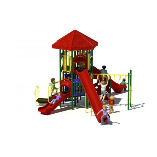 The PS3-28762 supplies children from ages 5-12 endless hours of fun. Children can reach the tower through a multitude of ways, including the challenging Bubble Wall Climber and Tri Rung Horizontal Ladder. Once the top of the tower is reached children can both rest and play with several panels in the shade of the Hex Shingle Roof or they can enjoy the thrill of sliding down one of the three slides.
