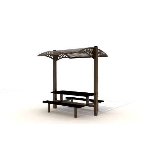 Name: Picnic Table with Shade Series: Site Amenities Age Group: 2-12 # of Play Activities: Child Capacity: 6-8 Use Zone: N/A Max Fall Height: N/A Equipment or Structure Size: 6'-5" x 6'-5" x 8'-0" Structure Weight 550